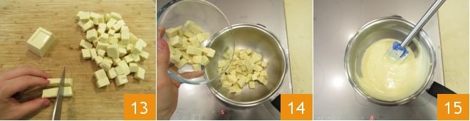 Kommen wir jetzt zur Creme: Zerhacken Sie die weiße Schokolade fein 13, geben Sie sie in ein Wasserbad 14 und lassen Sie sie unter gelegentlichem Rühren schmelzen 15.