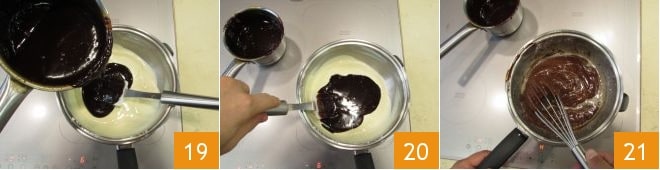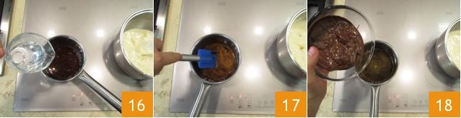 In der Zwischenzeit nehmen Sie die Kaffeepaste, wiegen Sie 50 g ab und geben Sie sie in einen kleinen Topf. Geben Sie auch das Wasser in den kleinen Topf 16, rühren Sie und erhitzen Sie bis zum Kochen 17. Sobald die weiße Schokolade geschmolzen ist und die Kaffeepaste kocht, können Sie die Herdplatte ausschalten. Zum Kaffee im Topf geben Sie die Haselnusscreme hinzu und rühren 18.
