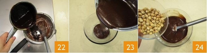 und schließlich auch das letzte Drittel 22. Rühren Sie weiter; sobald die Mischung weich und viskos geworden ist, geben Sie sie in eine Schüssel 23 und fügen die zuvor gerösteten Haselnüsse hinzu und rühren um 24.