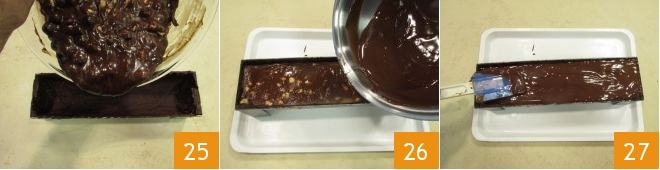 Gießen Sie alles in die Form 25. Zum Abschluss schmelzen Sie 200 g dunkle Schokolade im Wasserbad und verwenden Sie sie, um den Boden der Form zu bedecken 26. Glätten Sie die Oberfläche mit einem Spatel 27.