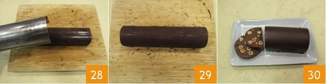Stellen Sie alles in den Kühlschrank und lassen Sie es mindestens 6 Stunden gut fest werden. Am nächsten Tag genügt es, die Form auf ein Schneidebrett zu klopfen, um den Torrone dei Morti mit Kaffee zu lösen 28. Jetzt, da er fertig ist, müssen Sie ihn nur noch in Scheiben schneiden und genießen (29-30).