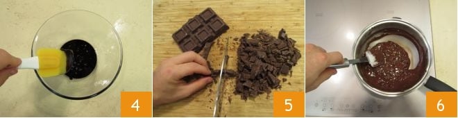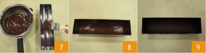 Sobald die Schokolade geschmolzen ist, pinseln Sie das Innere der Form mit der Schokolade ein 7 und stellen Sie sie dann für 10 Minuten in den Kühlschrank 8. Nach der Zeit ist sie fest geworden 9,
