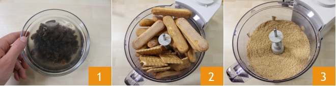 Um das Totenbrot zuzubereiten, beginnen Sie damit, die Rosinen abzuspülen und dann in einer kleinen Schüssel mit Wasser einzuweichen (alternativ können Sie sie direkt mit dem Vin Santo aus dem Rezept einweichen) 1. In der Schüssel eines Mixers geben Sie die trockenen Kekse, Amaretti und (wenn ausreichend leistungsstark) auch Löffelbiskuits: Wenn sie nicht hineinpassen, können Sie sie portionsweise zerkleinern 2. Schalten Sie den Mixer ein und zerkleinern Sie alles zu feinen Bröseln: Übertragen Sie die Mischung in eine große Schüssel 3.