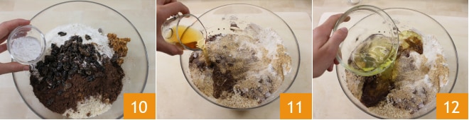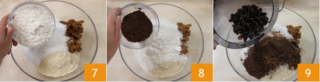 das Mehl 7, den Kakao 8, eine Prise Muskatnuss und Zimt. An diesem Punkt die Rosinen gut abseihen und ausdrücken und der Mischung hinzufügen 9,
