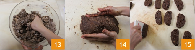 Beginnen Sie, alle Zutaten mit den Händen oder falls Sie möchten mit einem Spatel oder einem Holzlöffel zu vermischen 13 und wenn die Masse ausreichend kompakt ist, übertragen Sie sie auf ein leicht bemehltes Teigbrett und arbeiten Sie sie mit den Händen, bis Sie einen homogenen und ziemlich festen Teig erhalten. Formen Sie einen Laib 14 und schneiden Sie ihn in Scheiben von je 90-100g 15.