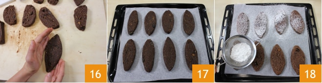 Formen Sie die verschiedenen Stücke so, dass sie eine eher flache Form von etwa 1 cm erhalten, verjüngen Sie sie auf eine Länge von etwa 12-15 cm und eine Breite von 5-6 cm 16. Versuchen Sie, in dieser Phase kein Mehl hinzuzufügen. Bedecken Sie ein Backblech oder eine Backform mit Backpapier und legen Sie Ihr Totenbrot darauf, mit ein paar cm Abstand zueinander 17, beim Backen neigen sie dazu, etwas zu wachsen. Backen Sie die Kekse im vorgeheizten Ofen bei 180° für etwa 25 Minuten, nehmen Sie sie dann heraus, bestäuben Sie sie mit Puderzucker 18 und lassen Sie sie abkühlen. Servieren Sie das Totenbrot erst, nachdem Sie es mindestens zwei Tage ruhen lassen haben, auf diese Weise werden sie richtig weich.