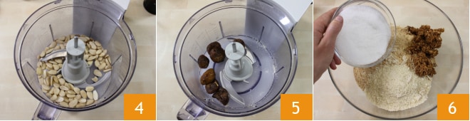 Geben Sie nun in denselben Mixer die Mandeln und mahlen Sie sie zu Mehl 4, dann fügen Sie sie zu den zerkleinerten Keksen hinzu. Nun zerkleinern Sie auch die getrockneten Feigen im Mixer und geben Sie sie in die Schüssel 5. Fügen Sie diesen Zutaten den Kristallzucker hinzu 6,