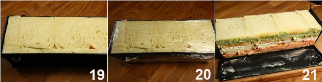 schließen Sie dann erneut mit dem Vollkornbrot 16 ab und setzen Sie das letzte Schicht mit der Pestocreme 17 zusammen. Decken Sie es mit der letzten Schicht Weißbrot ab. Um die gesamte Oberfläche des Kastenkuchens zu bedecken, schneiden Sie eine Scheibe in Streifen 18