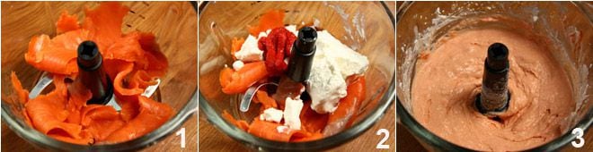 Zuerst die Cremes zubereiten. Geben Sie den Lachs in einen Mixer 1, fügen Sie den Ricotta und das Tomatenmark hinzu 2, um die Lachscreme zu erhalten 3, und stellen Sie sie beiseite.