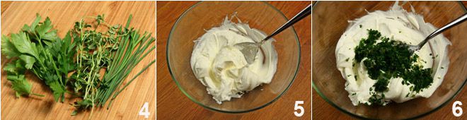 Fahren Sie dann mit der Kräutermousse fort, hacken Sie die Kräuter fein 4, fügen Sie den Frischkäse hinzu (5-6) und mischen Sie gut, bis alles vollständig vermengt ist.