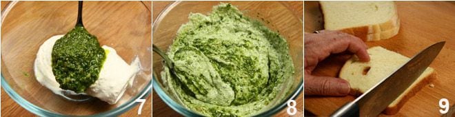 Bereiten Sie dann die Pestocreme zu 7, indem Sie sie zum Ricotta hinzufügen und gut vermischen 8. Sobald die Cremes zubereitet sind, beginnen Sie, die Brotschichten zusammenzusetzen. Schneiden Sie die Rinde von den Weißbrotscheiben 9