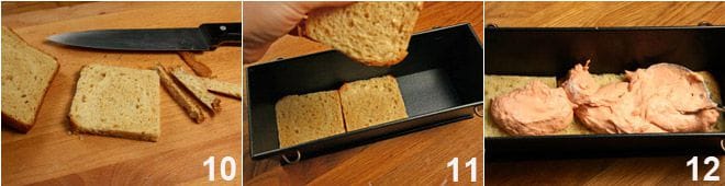 und auch von den Vollkornbrotscheiben 10 ab und legen Sie sie auf den Boden einer Kastenform 11 mit den Maßen 26x9x7 cm, vorzugsweise eine mit abnehmbarem Boden. Dann bestreichen Sie sie mit der Lachscreme 12