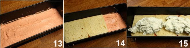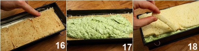 und glätten Sie sie gut mit einem Spatel 13. Schließen Sie mit den Weißbrotscheiben 14 ab und bestreichen Sie sie mit der Kräutercreme wie bei der ersten Schicht 15,