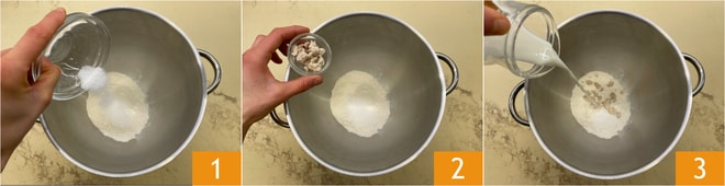 Um den veganen Zopf vorzubereiten, kümmern Sie sich zunächst um den Vorteig. Geben Sie das Mehl in die Rührschüssel, fügen Sie den Zucker 1, die Hefe 2 und die Sojamilch 3 hinzu. Kneten Sie mit dem Knethaken, bis ein homogener Teig entsteht.