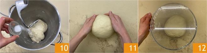 Fügen Sie das Salz 10 hinzu und kneten Sie weiter, bis es aufgenommen ist. Wechseln Sie dann auf die Arbeitsfläche, geben Sie dem Teig einige Faltbewegungen und formen Sie dann einen Teigball 11. Legen Sie ihn in eine Schüssel, bedecken Sie ihn mit Frischhaltefolie 12 und lassen Sie ihn bis zur Verdopplung aufgehen, das dauert etwa 2 Stunden.