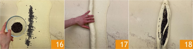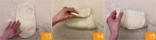 Nehmen Sie den Teig zurück und legen Sie ihn auf eine leicht bemehlte Arbeitsfläche und ziehen Sie ihn mit den Händen zu einem Rechteck 13. Falten Sie die beiden kurzen Seiten zur Mitte 14, dann falten Sie es in der Mitte, indem Sie die neuen kurzen Seiten zusammenbringen 15. Rollen Sie ihn mit einem Nudelholz aus, bis Sie ein Rechteck von etwa 0,5 cm Dicke erhalten.