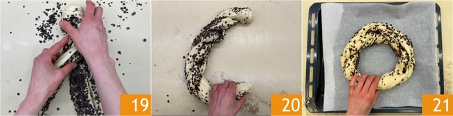 Flechten Sie die beiden Teigstränge 19. Verbinden Sie die Enden, um einen Kreis zu bilden 20 und legen Sie ihn auf ein Backblech, das mit Backpapier bedeckt ist 21. Lassen Sie ihn 1 Stunde im ausgeschalteten Ofen mit eingeschaltetem Licht aufgehen.