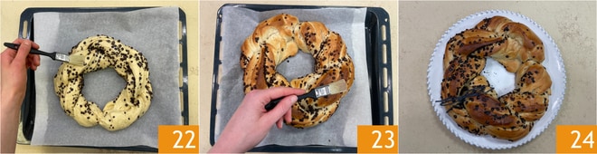 Bestreichen Sie die Oberfläche mit Sojamilch 22 und backen Sie ihn im vorgeheizten statischen Ofen bei 190°C für 25 Minuten im unteren Teil des Ofens. Nehmen Sie ihn heraus und bestreichen Sie ihn erneut mit Sojamilch 23. Ihr veganer Zopf ist bereit zum Genießen 24.