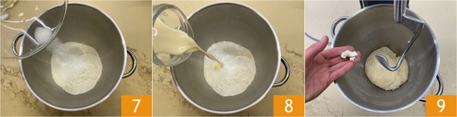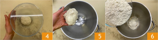 Legen Sie ihn in eine Schüssel, bedecken Sie diese mit Frischhaltefolie 4 und lassen Sie ihn bis zur Verdopplung aufgehen, das dauert etwa 1 Stunde. Nehmen Sie den Vorteig zurück und legen Sie ihn wieder in die Rührschüssel 5, dann fügen Sie das Mehl 6 hinzu.