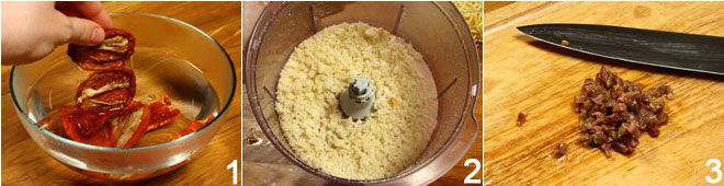Weichen Sie die getrockneten Tomaten in einer Schüssel mit heißem Wasser ein 1, bis sie wieder weich sind (10-15 Minuten). In der Zwischenzeit entfernen Sie die Kruste vom Brot und zerkrümeln Sie die Brotkrume zu feinen Krümeln mit Hilfe der Klingen einer Küchenmaschine 2. Lassen Sie das Öl von den Sardellen abtropfen und hacken Sie sie fein 3;
