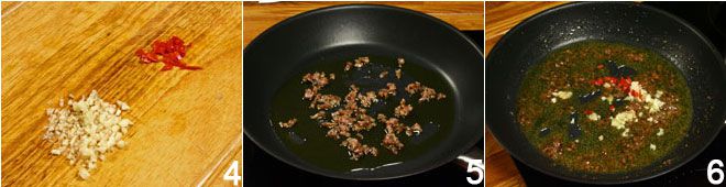 Hacken Sie auch die Knoblauchzehe und den Chili, nachdem Sie die Samen entfernt haben 4. Geben Sie 3 Esslöffel Öl in eine Pfanne und braten Sie die Sardellen bei niedriger Hitze an, bis sie sich auflösen 5, dann fügen Sie den gehackten Knoblauch und den Chili hinzu 6.