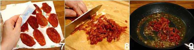 Lassen Sie die eingeweichten getrockneten Tomaten gut abtropfen, tupfen Sie sie mit Küchenpapier ab 7 und schneiden Sie sie in dünne Streifen 8; fügen Sie sie hinzu und lassen Sie sie einige Sekunden mit den anderen Zutaten in der Pfanne anbraten 9.