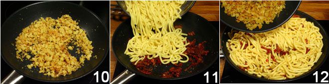 In einer anderen Pfanne erhitzen Sie 3 Esslöffel Öl und bräunen Sie die Brotkrume an 10, bis sie knusprig ist. In der Zwischenzeit kochen Sie die Troccoli in leicht gesalzenem Wasser (aufgrund des hohen Salzgehalts der Sauce), lassen Sie sie abtropfen und braten Sie sie einige Sekunden in der Pfanne mit der Mischung aus getrockneten Tomaten 11, wobei Sie, falls nötig, einige Esslöffel Kochwasser hinzufügen, um alles zu vermischen. Nachdem Sie die Hitze abgeschaltet haben, fügen Sie die knusprige Brotkrume hinzu 12, dann richten Sie an und servieren Sie sofort.