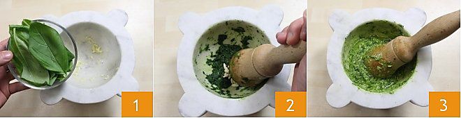 Um die Trofie alla Portofino zuzubereiten, beginnen Sie mit der Zubereitung des Pestos nach dem Rezept des Pesto alla Genovese. Nehmen Sie einen Mörser (alternativ können Sie, falls kein Mörser zur Verfügung steht, den Mixer verwenden), geben Sie den Knoblauch hinein, beginnen Sie ihn zu zerstoßen, und fügen Sie dann die Basilikumblätter 1 zusammen mit einer Prise grobem Salz hinzu. Zerdrücken Sie das Basilikum gegen die Wände des Mörsers, indem Sie den Stößel von links nach rechts drehen und gleichzeitig den Mörser in die entgegengesetzte Richtung (von rechts nach links) drehen. Wenn die Basilikumblätter eine leuchtend grüne Flüssigkeit abgeben, fügen Sie die Pinienkerne hinzu und beginnen Sie erneut zu stoßen. Fügen Sie die Käsesorten hinzu und zuletzt das extra native Olivenöl, das in einem dünnen Strahl eingegossen wird, während Sie ständig mit dem Stößel mischen. Mischen Sie die Zutaten gut, bis eine homogene Sauce entsteht 3. Das Pesto ist fertig, stellen Sie es beiseite.