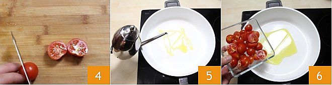Kümmern Sie sich nun um die Tomatensauce: Waschen Sie die Kirschtomaten, schneiden Sie sie in Hälften 4, geben Sie einen Esslöffel Olivenöl 5 in eine Pfanne auf den Herd, fügen Sie die Kirschtomaten hinzu 6