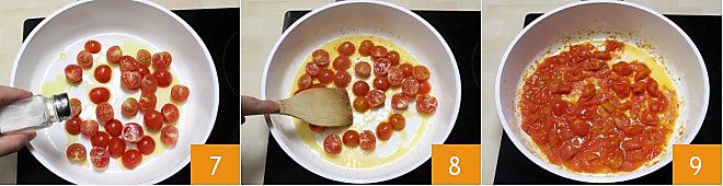 salzen Sie 7 und kochen Sie die Kirschtomaten bei mittlerer Hitze 8, bis sie zerfallen 9.