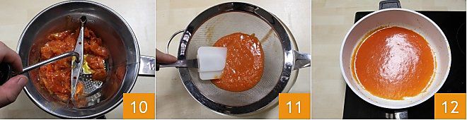 Geben Sie nun die Tomaten in eine Passiermühle 10. Um die Sauce zu erhalten, passieren Sie sie durch ein Sieb 11, um die Samen zu entfernen, und geben Sie sie zurück in die Pfanne 12.