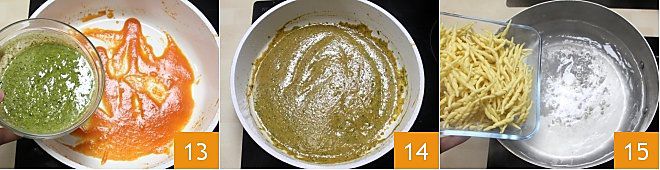 Nun fügen Sie die zuvor zubereitete Pesto zur gewonnenen Tomatensauce hinzu 13. Rühren Sie, um eine gut homogene Sauce zu erhalten 14. Bereiten Sie schließlich die Trofie zu: Stellen Sie einen Topf mit reichlich gesalzenem Wasser auf den Herd, bringen Sie es zum Kochen und fügen Sie die Trofie hinzu 15,
