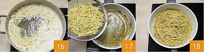 kochen Sie die Trofie 16. Wenn sie gar sind, gießen Sie die Trofie ab und geben Sie sie zur Pesto-Tomaten-Sauce 17. Rühren Sie gut um, damit die Pasta den Geschmack annimmt 18 und servieren Sie die Trofie alla Portofino heiß.