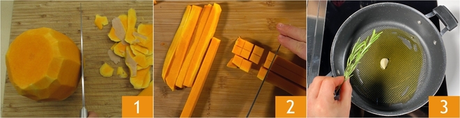 Fügen Sie den Kürbis hinzu 4 und braten ihn einige Minuten an, dann entfernen Sie den Knoblauch und den Rosmarin 5, gießen das Wasser dazu 6 und kochen alles bei schwacher Hitze 10-15 Minuten oder bis der Kürbis weich ist. Salzen Sie nach Geschmack.