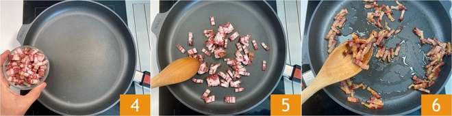 Gib sie in eine sehr große Pfanne 4 und brate sie bei mittlerer bis hoher Hitze 4-5 Minuten unter häufigem Rühren, bis sie knusprig sind 6. Wenn du möchtest, kannst du in dieser Phase auch die Schwarte hinzufügen, sie wird ihren gesamten Geschmack abgeben!