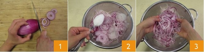 Die Zwiebeln putzen und in dünne Scheiben schneiden 1. In ein Sieb geben, das Sie auf eine Schüssel gestellt haben, und mit 2 Esslöffeln Salz bestreuen 2. Gut mit den Händen mischen und etwa zehn Minuten lang massieren 3, bis sie weich geworden sind und Flüssigkeit abgegeben haben.