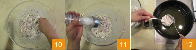 Die Mischung mit den Händen zu einem Teig verarbeiten, bis sie vollständig homogen ist 10, und mit Salz abschmecken 11. Reichlich Öl erhitzen, bis es 170° erreicht hat, dann mit Hilfe von zwei Löffeln ein paar Krapfen auf einmal eintauchen 12.