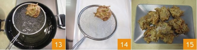 Die Krapfen etwa 8 Minuten lang frittieren, bis sie goldbraun sind 13, dann nach und nach auf ein mit Küchenpapier ausgelegtes Tablett legen, um das überschüssige Öl zu entfernen 14, und Ihre noch warmen Tropea-Zwiebelkrapfen servieren 15.
