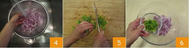 Dann gut abspülen, um das überschüssige Salz zu entfernen 4, das Wasser abtropfen lassen und in eine Schüssel geben. Die Petersilie hacken 5 und zu den Zwiebeln geben 6.