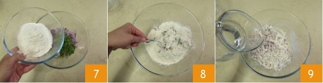 Dann das Mehl hinzufügen 7, alles vermengen 8 und auch das Wasser dazugeben 9.