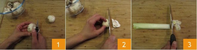 Um die überbackenen Sedanini im Ofen zuzubereiten, beginnen Sie mit der Reinigung der Champignon-Pilze. Nachdem Sie den erdigen Boden entfernt haben 1, reinigen Sie die Oberfläche mit einem feuchten Tuch. Schneiden Sie sie in Scheiben 2 und legen Sie sie beiseite. Dann reinigen Sie den Lauch, indem Sie die äußeren Blätter entfernen und den Lauch abschneiden, danach in dünne Ringe schneiden 3.