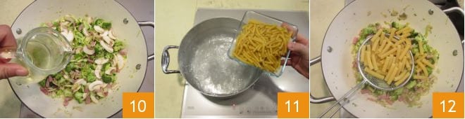 Sobald die Basis gut angebraten ist, salzen Sie leicht, löschen Sie mit Weißwein ab 10 und lassen Sie den Alkohol verdampfen, bevor Sie die Hitze reduzieren und für weitere 10 Minuten köcheln lassen. In der Zwischenzeit kochen Sie die Pasta in kochendem Salzwasser 11, sobald sie al dente ist, gießen Sie sie direkt in die Pfanne ab 12.