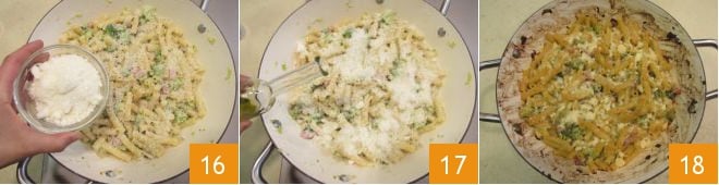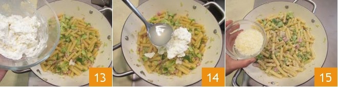 Fügen Sie den Ricotta hinzu 13, eine Kelle des Kochwassers der Pasta und verrühren Sie 14. Nachdem Sie die Konsistenz angepasst haben, können Sie den Herd ausschalten und den geriebenen Caciocavallo hinzufügen 15