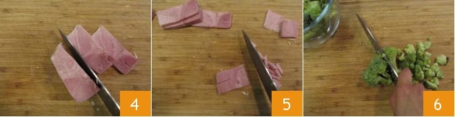 Mit einem Messer schneiden Sie den gekochten Schinken in Scheiben, diese sollten etwa einen halben Zentimeter dick sein 4. Schneiden Sie dann kleine Würfel daraus 5. Schließlich zerkleinern Sie grob die Brokkoliröschen 6 und beginnen mit dem Kochen.