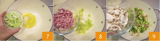 In einem Topf, der für den Ofen geeignet ist, erhitzen Sie etwas Olivenöl und geben den Lauch 7 und den Schinken 8 hinein. Lassen Sie es kurz anbraten, bevor Sie auch die Brokkoli und Pilze hinzufügen 9.