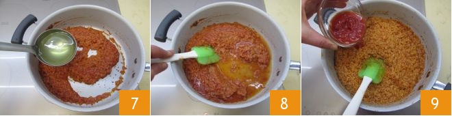 Fahren Sie mit dem Kochen fort, indem Sie einen Schöpflöffel Brühe hinzufügen 7 und lassen Sie die Brühe fast vollständig verdampfen, bevor Sie mehr hinzufügen 8; fügen Sie dann auch das dreifache Tomatenmark hinzu 9 und beenden Sie das Kochen des Reises: es wird etwa 15 Minuten dauern.