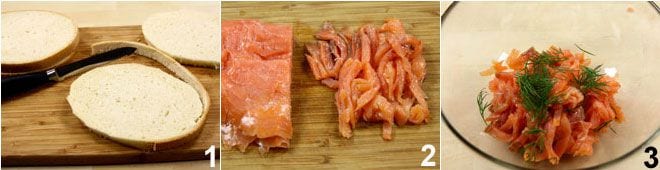 Um die Eier im Cocotte mit geräuchertem Lachs zuzubereiten, beginnen Sie damit, die Kruste von den Brotscheiben mit einem Messer zu entfernen 1, bestreichen Sie sie leicht mit nativem Olivenöl extra und grillen Sie sie ein paar Minuten im Ofen, im Grillmodus, wobei Sie sie während des Backens wenden. Schneiden Sie in der Zwischenzeit den geräucherten Lachs in dünne Streifen 2 und geben Sie ihn in eine Schüssel, fügen Sie die Dillzweige hinzu 3