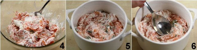 die Ricotta und vermischen Sie die Zutaten gut 4. Buttern Sie 4 Ofencocottes, geben Sie die Mischung aus Lachs und Ricotta hinein 5 und machen Sie mit der Rückseite eines Teelöffels eine kleine Vertiefung in der Mitte jeder Cocotte 6.