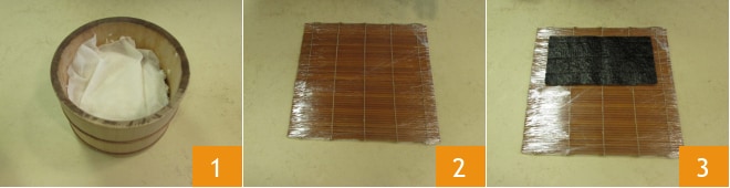 Wickeln Sie die Makisu in Frischhaltefolie ein und legen Sie sie auf eine Arbeitsfläche 2; platzieren Sie ein halbes Blatt Nori-Alge mit der glänzenderen Seite zur Matte hin. Die Alge sollte zu Ihnen hin ausgerichtet sein, fast am Rand der Makisu, wobei etwa 1 cm Abstand zum Rand gelassen wird 3.