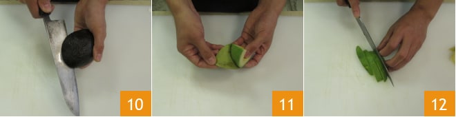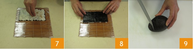 Streuen Sie die gemischten Sesamsamen darüber 7. Heben Sie die Alge vorsichtig an und drehen Sie sie um, sodass der Reis mit der Matte in Kontakt ist und die Alge nach oben zeigt 8. Nehmen Sie die Avocado und schneiden Sie die Enden ab 9,